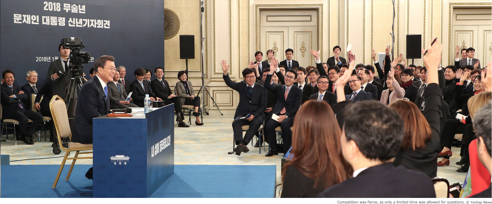 As soon as the announcement of the Q&A session ended, the reporters’ hands shot into the air. The competition to be selected was fierce, this being only the second official press conference for President Moon after the first one held on the 100th day after his inauguration. One reporter raised both hands, while another held up a Pyeongchang Winter Olympics mascot doll. Although the questioners were to be selected based on whose eyes met the president’s, there was too little time to just hope that their eyes would meet, and too many reporters in the room were hoping to have their questions answered. The strategy was to just raise whatever might catch the president's eye. At one point, there was a call to refrain from yelling out questions, where journalists insisted that their eyes had met. This led to the room bursting into laughter even amid the fierce competition.