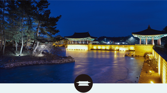 The Donggung Palace and Wolji Pond are the site of a royal villa from Shilla (57 B.C. - A.D. 935), representative of gardens and ponds from that period. According to records, the pond was dug and hills were built in the 14th year of the reign of King Munmu (r. 661-681) to house exotic birds and strange beasts. According to the "History of the Three Kingdoms" (Samguk Sagi, 삼국사기, 三國史記), compiled in 1145, a party was held there in 931 hosted by Shilla King Gyeongsun (r. 927-935) in honor of the Goryeo founder King Taejo (r. 918-943), showing that the palace was used to host banquets for foreign officials and to entertain important guests. These banquets were usually held around March or September, when the area’s natural beauty was at its peak. While Wolji Pond in daylight is tranquil and peaceful, it comes to life with bright lighting at night, offering visitors a dazzling night view. Visitors are also recommended to take the 10 minute walk from the Wolji Pond to the Cheomseongdae, which is yet another impressive night spot that adds to the beauty of Gyeongju.