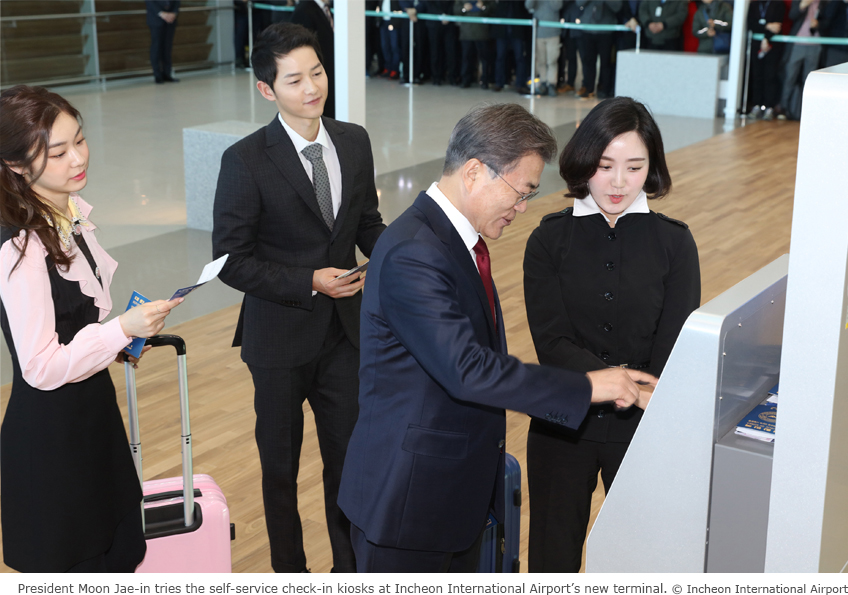 Operated separately from Terminal 1, the new passenger terminal has its own check-in system, security, customs and boarding gates. It houses four airlines from the SkyTeam alliance: Korean Air, KLM Royal Dutch Airlines, Delta Air Lines and Air France. Passengers flying on these airlines will use Terminal 2. President Moon was impressed by the terminal’s smart technology, such as the location-based guide robots, 3-D guide maps, self check-in kiosks and the 360-degree security scanner. With the help of a guide robot, the president used the self check-in kiosk and bag drop service, along with Kim Yuna and Song Joong-ki. Thanks to the introduction of a self-ticketing and bag drop, passengers can skip the queues and save time when using the second terminal.