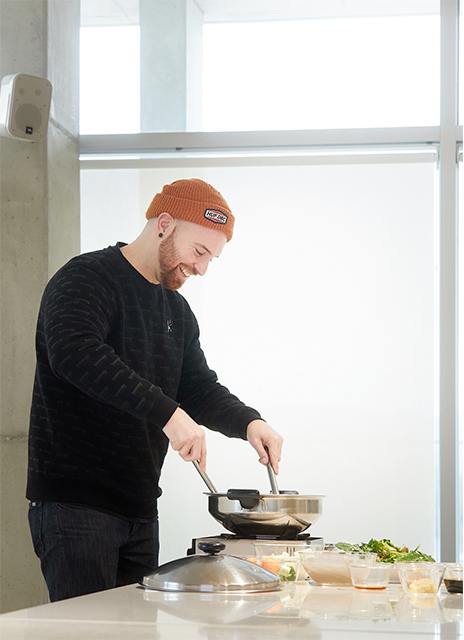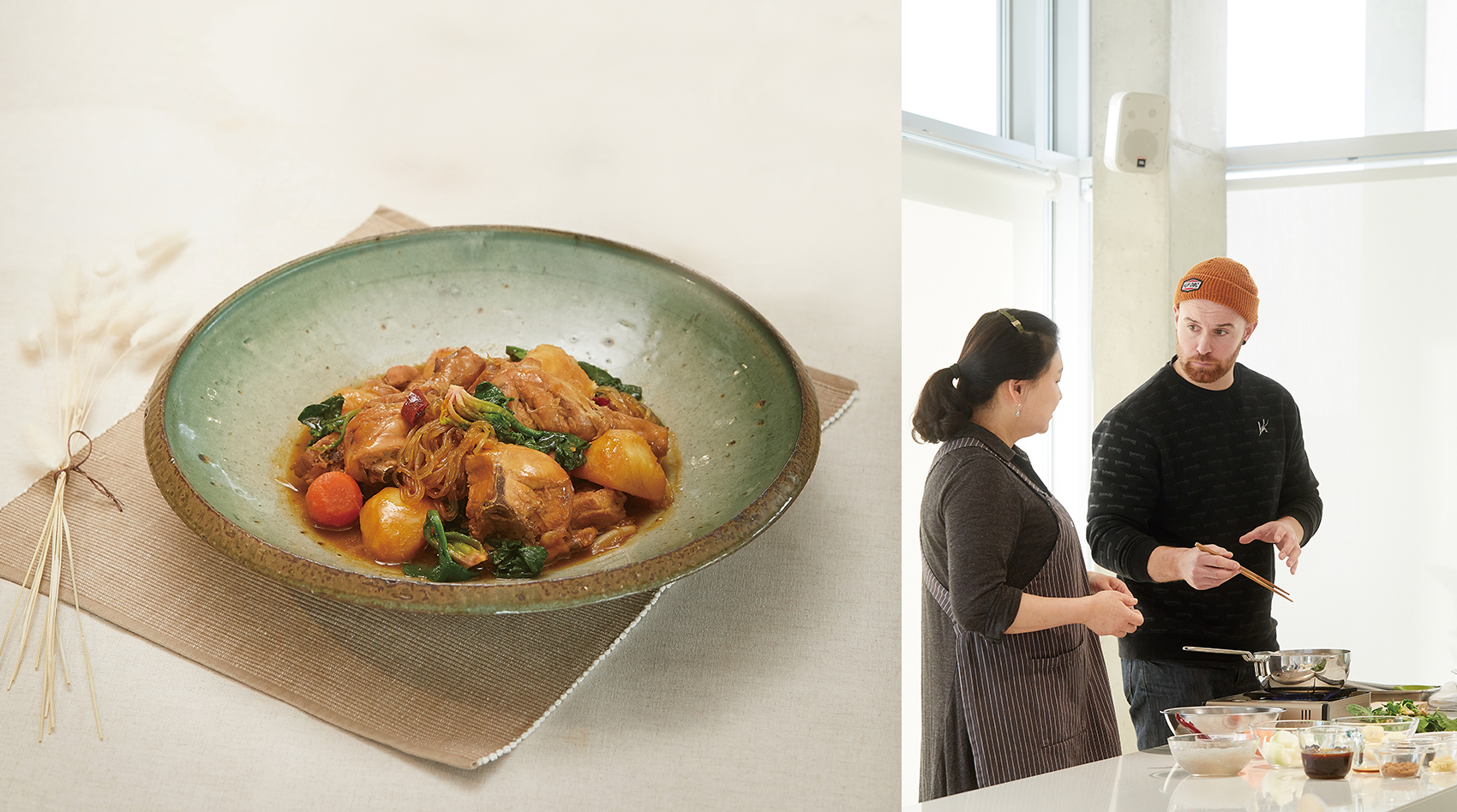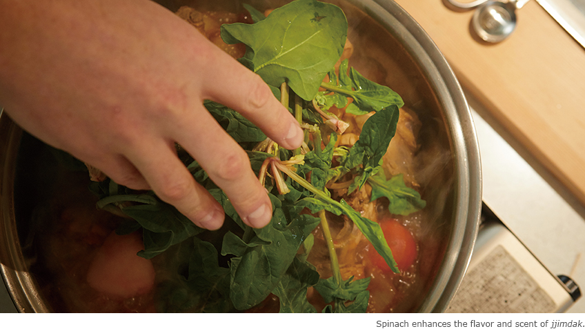 Hoagland, whose birthday is just around the corner, wants to cook jjimdak for his party this year. As an early birthday gift, we took him to a nearby cooking studio for a quick lesson. You can tell how much Hoagland enjoys jjimdak from his choice of spicy red chili peppers. Having lived in Korea for nine years, he said in fluent Korean that, “jjimdak is based on soy sauce, but the red chilies give it a hint of spice.” He brought the chilies close to his nose and took a whiff. He nodded as the instructor introduced the ingredients, but was surprised to see spinach instead of green onions, which are usually piled on top of the chicken.