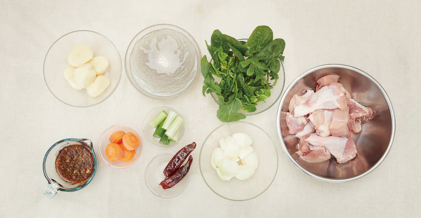 1 kg chicken cut into chunks, 2 potatoes, ½ carrot, 1 onion, ½ stalk of green onion, 2 dried red chili peppers, one handful of spinach, two servings of glass noodles