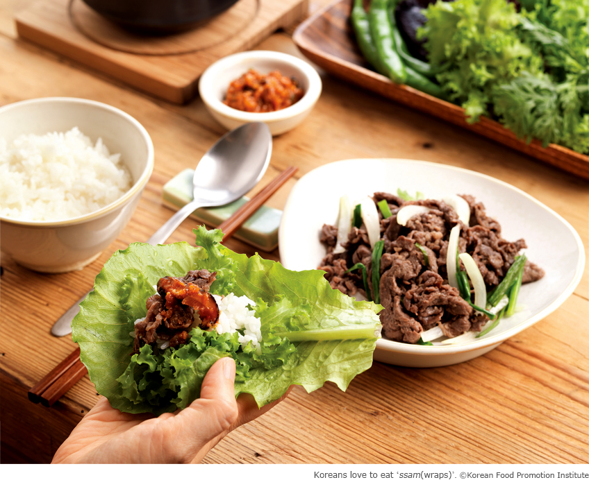 Side dishes containing meat or fish add animal proteins to the sweetness of the rice. The amino acids in the animal protein mix with the rice to fill the mouth with a savory taste. Just fill a lettuce leaf with a spoonful of rice, a piece of well-grilled pork, and some cabbage or spring onion kimchi, then wrap it all up, put it in your mouth and chew. The delightfulness of this combination is known only to those who have tried it.