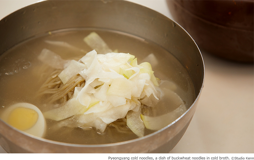 Sometimes people opt for Pyeongyang-style cold buckwheat noodles after a meal of fried ribs or pork barbecue. In this case, the noodles act as a substitute for the rice, the broth of the noodles for the soup, and a white kimchi for the side dish. People often pair fried chicken with pickled radishes, colloquially called “chicken radish.” The pickled radishes refresh the palate in a way similar to kimchi when kimchi is consumed with rice. There are also people who drink the sweet and sour brine of the pickled radish because they’re used to pairing a soup with solid food.