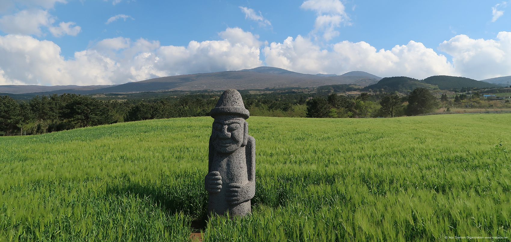 When you arrive on Jejudo Island, the first thing you see will be the dol hareubang phallic rock statues carved out of black basalt, and the exotic green palm trees. Wherever you go on Jejudo Island, you will see dark basalt, almost pure black, and green plants surrounded by the volcanic rocks. As Jejudo Island was formed by volcanoes, the entire landscape is formed of basalt, making it the most easily available material for rock statues. The green crops surrounded by basalt walls, and traditional basalt homes with green trees standing in the yard, form the landscape of Jejudo Island. The basalt, which is not exactly black, but a deep brown, close to black, creates a delightful contrast with the green plants, a color combination symbolic of Jejudo Island. All throughout your trip on Jejudo Island, you will see the dark basalt rocks create beautiful harmony with a symphony of colors: yellow, green, orange and emerald green.