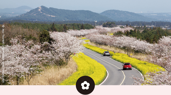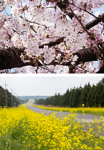 Photos taken by tourists on Jejudo Island in the spring will always include yellow canola blossoms. Noksan-ro is a stretch of road famous for its canola blossoms, and a photo spot that's not to be missed in the spring. The road passes through the Noksanjang and Gapmajang pastures, some of the best grazing land on the Korean Peninsula. The road begins at the Seojing horse riding center in Gyorae-ri, Jocheon-eup, passes by the Jeongseok Aviation Museum, and leads to Gasi-ri, Pyoseon-myeon, in Seogwipo, forming a 10 km route for long drives. Once you start along Noksan-ro, the yellow canola blossoms lining the road on both sides fill your eyes, accompanied by the sound of soft classical music. For a brief period, both the canola and cherry blossoms bloom together on some parts of the road, creating a sight not to be missed. This road also claims fame as one of Korea’s official "100 most-beautiful roads." The Jejudo Island Canola Blossom Festival is held each year along Noksan-ro. This year’s will be held from April 7 to 15.