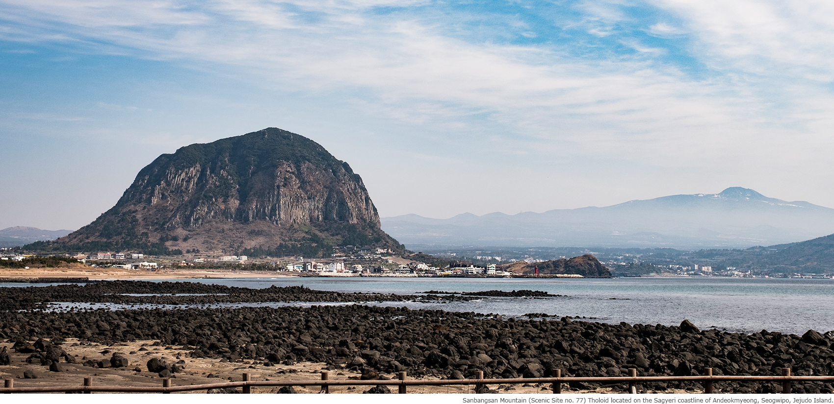 Drive along the coastal roads on Jejudo Island’s southwest coast and you will see Sanbangsan Mountain, a landmark in Sagyeri, Andeok-myeon. Sanbangsan Mountain is large enough to be seen from any part of southwest Jejudo Island, and is all the more eye-catching as it rises high above the ground from the surrounding flatlands.