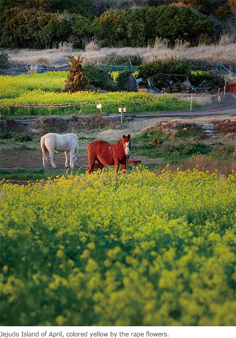 Jejudo Island is a volcanic island of many colors, from the yellow of canola blossoms, to green barley fields, orange mandarins, emerald green waters, royal pink azaleas, red photinias, purple hydrangeas and shinning silver grass, all set against the shade of the mountain and volcanic cones. April on Jejudo Island is filled with greens and yellows, the colors of spring. The yellow canola blossoms that dot the fields like a painting, and the deep-green barley sprouting from the ground, create scenery that's best enjoyed while walking slowly with many stops in between.