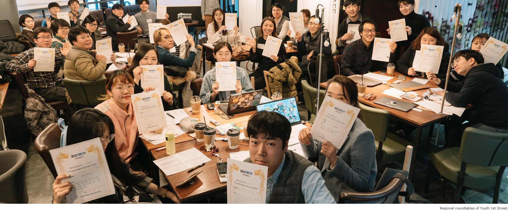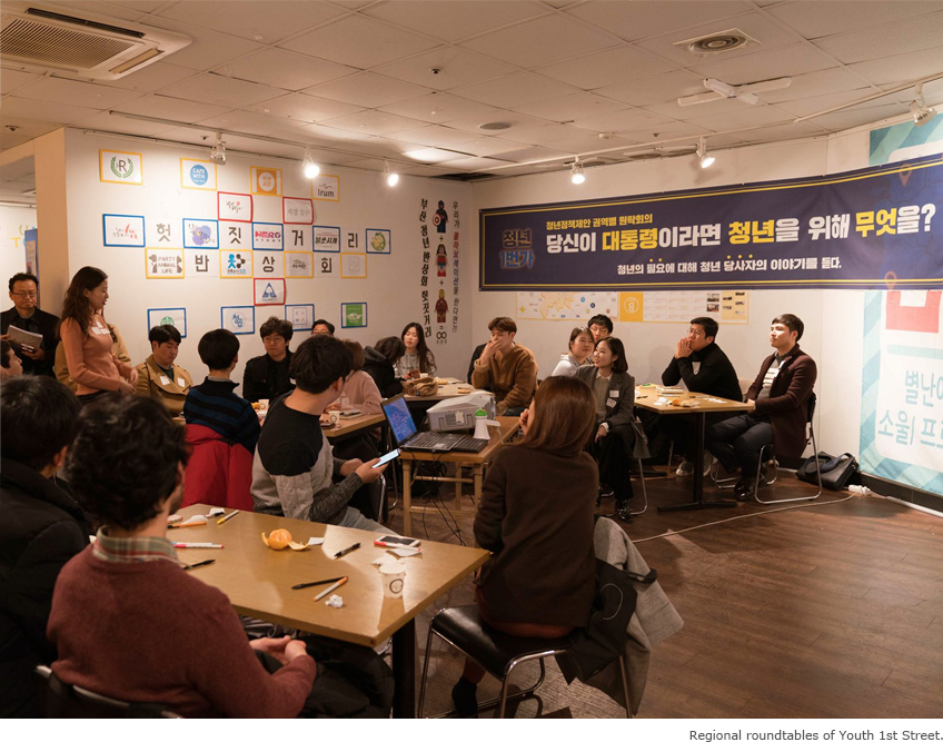 The website menu (www.youth1st.kr) is composed of online suggestions, roundtable meetings and youth events. There's also a social media account to reach out to young target audiences. A Facebook profile allows feedback, while also sharing information about Youth 1st Street events. The platform has given voice to a realistic and detailed exchange concerning the problems faced by young people, such as housing, debt, work, the stability of their livelihoods, social welfare and cultural issues.