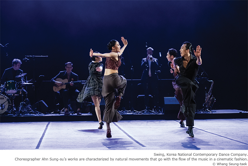 Ahn’s works have a brilliant visual effect. The audience can feel as if the beautiful gestures are drawing the music around the stage, and they can see the musical notes with their eyes. He said that he was inspired by music and movies. In “Swing,” performed last month, he featured the Swedish six-piece band Gentleman and Gangsters, which plays traditional New Orleans jazz. The value of his choreography is that the audience feels comfortable only when they can see and enjoy both the music and the dance. Last year’s “Immixture” was choreographed to commemorate the 130th anniversary of diplomatic ties between Korea and France. In this work, which took nearly four years from planning to creation, different East Asian and European musical forms were used in each scene, and modern movements and traditional dances were densely composed to the sound. The music covered various genres, including folk songs from southern Gyeonggi-do Province, the sound of traditional zithers, piano works by Schumann and even pop.