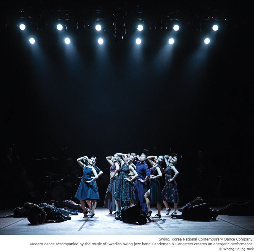 The performance was praised as “a rhythmical and fantastic clash of swing jazz music of the times and modern dance,” and it was performed by the Korea National Contemporary Dance Company and a Swedish swing jazz band.