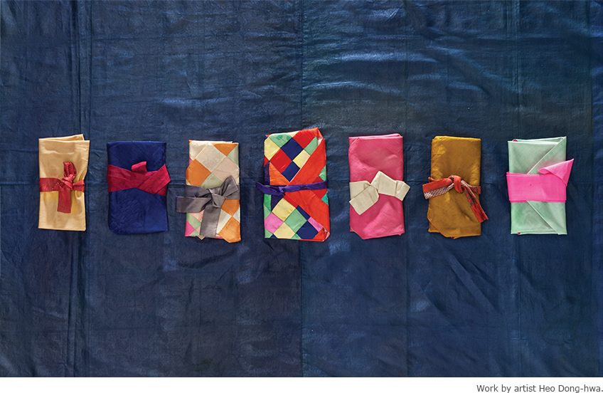 The practicality and compactness of the bojagi are its greatest strengths. It can wrap and cover anything, regardless of shape. It changes its own shape to fit the object it’s covering, and then returns to its square form after use. Lee Eo-ryeong uses the bojagi and the bag as metaphors to highlight the differences between East Asian and the Western philosophy. The bag, which fits objects into a fixed space, represents the rationality-based West, while the bojagi, which wraps itself fluidly around any shape for any use, represents the decentralized nature of the East.