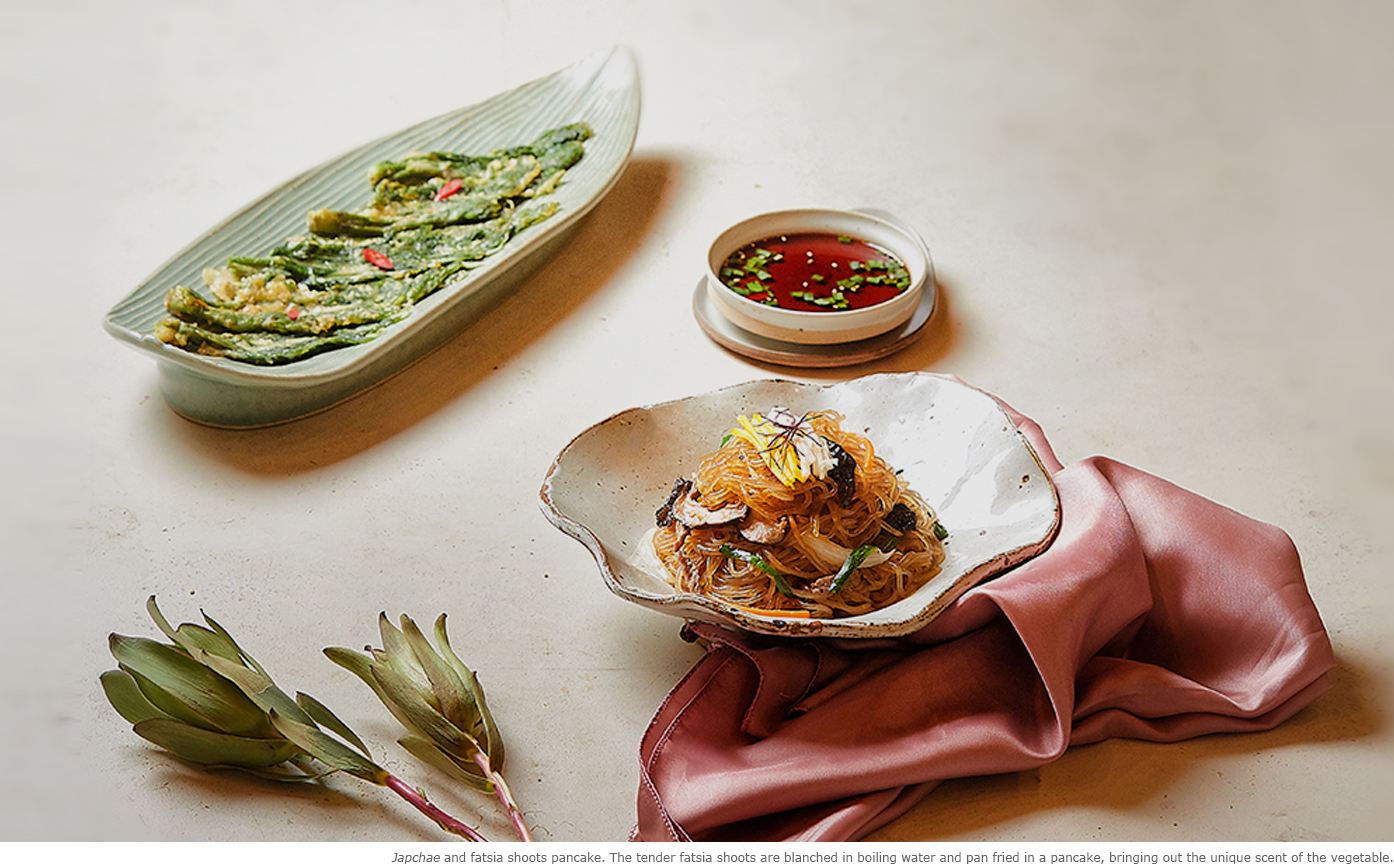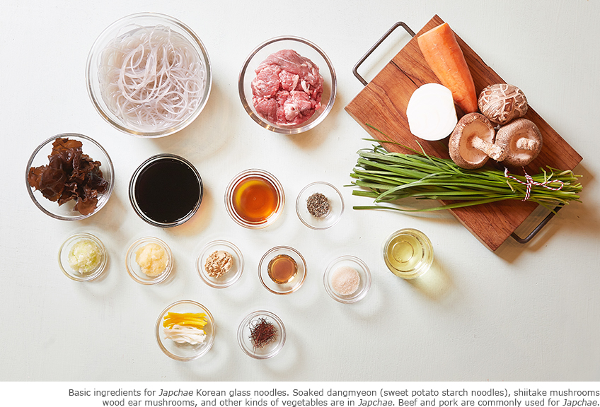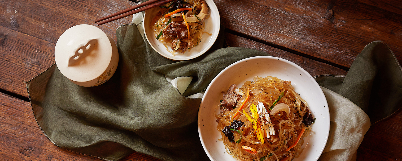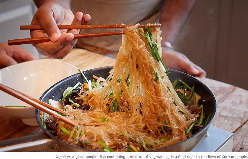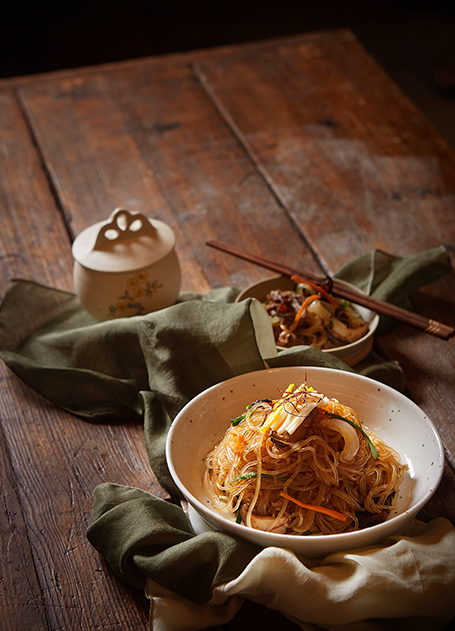 People prepare japchae stir-fried glass noodles with vegetables to welcome important guests. The dish, made from a variety of ingredients, is truly a gift from the heart. The glass noodles are first soaked in water, and the vegetables are washed and sliced. According to the recipe in “Eumsik Dimibang,” a book published in 1670, japchae at that time did not actually contain glass noodles, but featured more than 20 vegetables, such as cucumbers, radishes, several varieties of mushroom, and bellflower roots. Those who eat japchae stir-fried glass noodles with vegetables today cannot help but praise the dish, and this brings love and laughter to the dining table. Japchae may be a source of joy or merely a part of an already wholesome meal. Regardless, there is no denying that it has become deeply rooted in our lives.