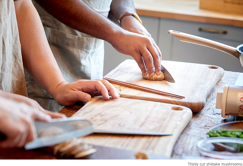 The two friends are fans of Korean cuisine, and describe japchae stir-fried glass noodles with vegetables as “soft and delicious.” When asked if they have ever tried the dish, Das replied, “Of course! Doesn’t it have seaweed?” Paul said, “I haven’t seen japchae with seaweed. Do you mean mushrooms?” The “seaweed” that Das is referring to is, in fact, wood ear mushrooms. The opportunity to cook some Korean food is another way to learn about East Asian ingredients. The two young men with aprons on look as excited as a couple going on a first date.