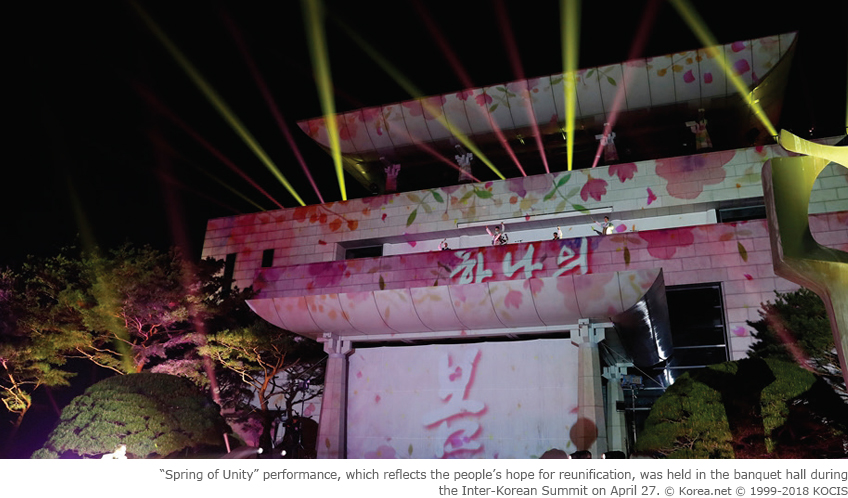 On April 27, 2018, the two leaders held hands at the Military Demarcation Line and crossed over to the South Korean side of Panmunjeom. After taking a walk to the Peace House, they sat together for dinner in the evening. The popular South Korean singer Cho Yong-pil took the stage with Hyon Song-wol, the head of North Korea’s Samjiyon Orchestra. Spring has arrived, and the future is bright for Panmunjeom. The people’s wishes led to intensive efforts, and such efforts eventually moved hearts.