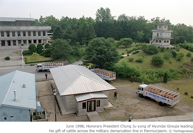 The doors to Panmunjeom flew open when the late Chung Ju-yung, the founder of Hyundai Group, visited the North with a herd of cattle. The scene was described as “the last work of avant-garde art of the 20th century” by the French critic Guy Sorman.
