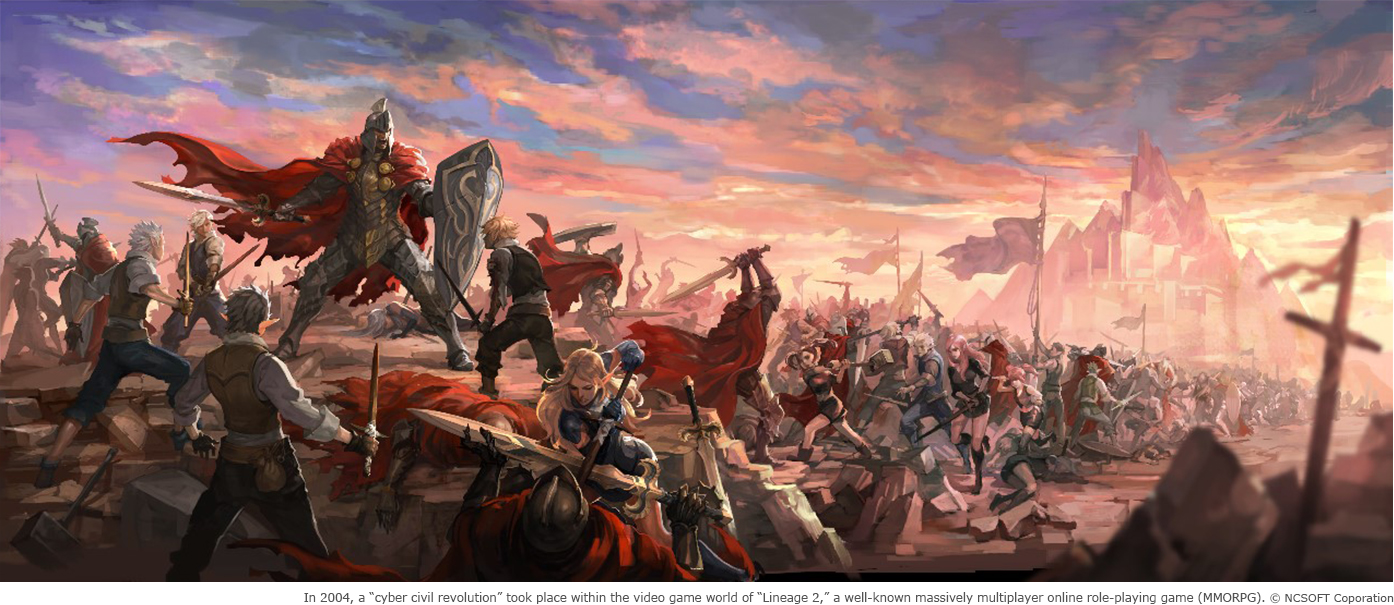 This groupist aspect of Korean online games gave birth to a new style of storytelling. In 2004, a “cyber civil revolution” took place within the video game world of “Lineage 2,” a well-known massively multiplayer online role-playing game (MMORPG). Inside the video game, people of a higher level enjoy greater power. This led to high-level players, people who played the game a lot, dominating weaker players. They took over so-called “hunting zones” and imposed excessively high “taxes” in the video game world. Other players soon heard about this, considered it to be abuse, and created their own video game profiles to participate in a video game protest. The high-level players tried to disperse the thousands of online protestors, but in the end acknowledged defeat. This unprecedented event, perceived to be an accurate mirror of society, created a paradigm shift in the domestic video gaming world. It is referred to as a “cyber civil revolution” by many media outlets, and even scholars have approached the episode as a case of “storytelling in a digital society.”