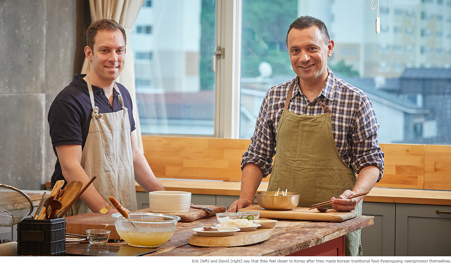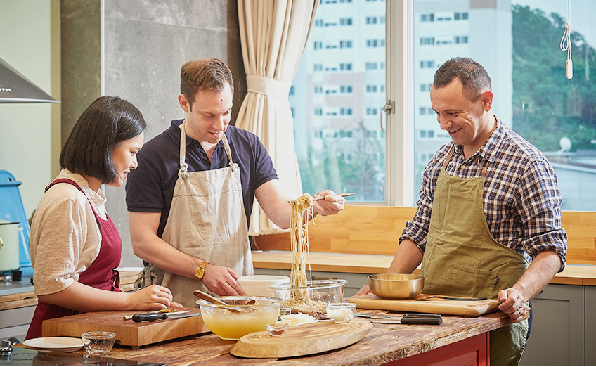 “Which cuts of beef are used? Do you have to use beef raised in Korea, or can it be beef raised in Australia?” David’s questions are those of an experienced home chef, befitting a man coming from the tradition of French cuisine. He is intent on learning every detail involved in making the dish. On the other hand, Eric seems nervously excited as he admits, “It’s awkward for me even to be cutting vegetables with a knife. Is the cucumber too thick? Should I make it thinner?”