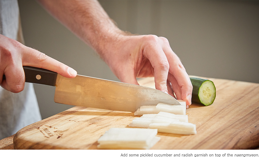 Now the noodles are ready to be placed in a large bowl. They take the form of naengmyeon once the toppings are added. The noodles are rolled up into a neat ball, upon which toppings are placed. This step of garnishing brings out the different personalities of the two chefs. Eric goes into deep thought, asking, “Should I place the radish in a crisscross pattern, or should they be aligned?” On the other hand, David is as creative as a Michelin-starred chef in decorating his naengmyeon. After adding a suitable amount of toppings, he places a slice of pear upright and scatters slivers of chili, proclaiming it to be a cannon salute to welcome peace on the Korean Peninsula.