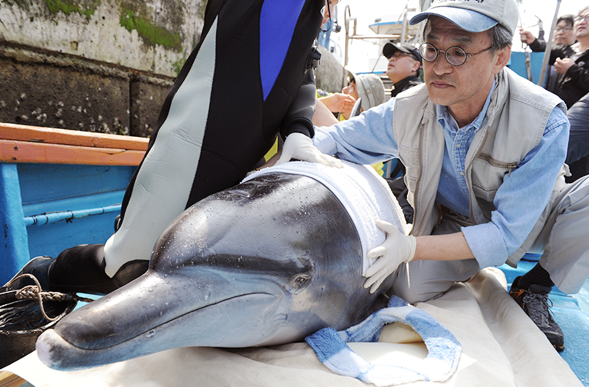 Choe takes care of a dolphin before he sends him off back to the sea. © Choe Jae-chun