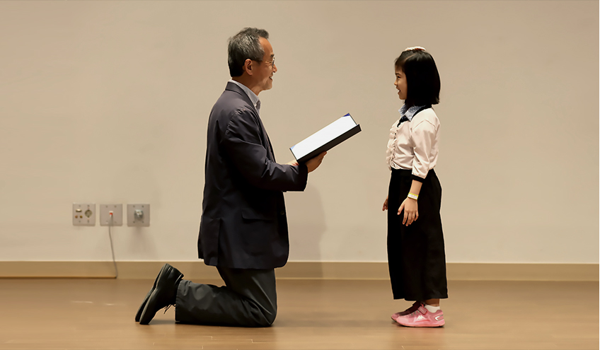 His humble attitude moves people’s heart. He awards a little girl while kneeling down at her height. © Choe Jae-chun