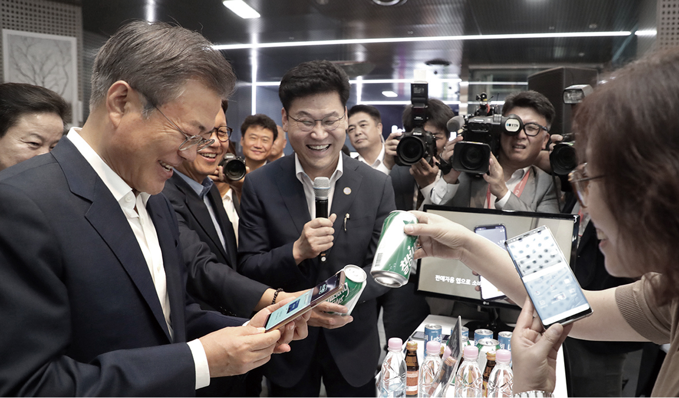 President Moon Jae-in tries out QR code shopping during an event to promote online banks at Seoul City Hall on Aug. 7.It’s true that new industries are pouring into the market, but the regulatory system still remains outdated, hindering growth. If this status quo continues, there will be no way for new players to play a role in driving the national economy, which, as a result, would lead to Korea lagging behind other economies on the global stage.In this sense, it’s a positive sign that the government is taking new approaches to change the economic environment. Amid the stagnant economy that faces the nation, which has forced the Bank of Korea on July 26 to revise downward its growth forecast for the year from 3 percent to 2.9 percent, wisely supporting new sources of future economic growth with more investments and deregulation would help the economy emerge from the current downturn and create an environment where the country could lead this digital competition.President Moon has vowed that he will preside over monthly meetings himself to review efforts to cut red tape and deregulation, a factor that many critics say will make or break the innovative growth policy. The government’s active engagement and action, not just words, will be crucial in making this happen.