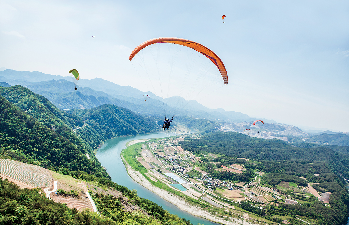 Mountainous Korea provides a perfect environment for paragliding. The blue open sky with the mountain ridges above the horizon is a sight to behold © Studio Kenn