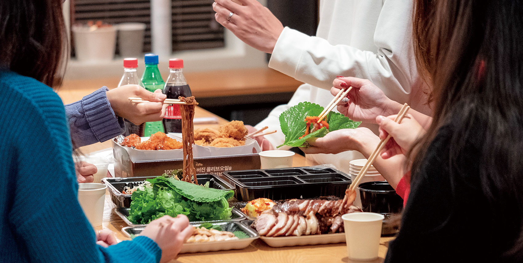 It’s not difficult to guess Koreans’ favorite delivery food. Fried chicken makes up 20 to 30% of all orders on the food delivery service app Baedalui Minjok. On days when major athletic matches are taking place, orders get backed up at even the tiniest neighborhood fried chicken stall. It is a rule of thumb that you should place an order a couple of hours ahead of the game if you want to enjoy a World Cup game with fried chicken. This beloved food is also the number one delivery item on traditional holidays. There was even a competition to find the best “chimmelier,” a portmanteau of chicken and sommelier. Jjajangmyun and tangsuyuk sweet and sour pork that represented delivery food in the 2000s have now been pushed to second place. Traditional Korean food with soups, side dishes and rice comes next. These days, delivery apps serve every kind of food you can name, from handmade burgers to steak, pasta, raw fish and even coffee and desserts. You don’t even need to go to a BBQ place for grilled pork belly and side dishes when it’s delivered right to your doorstep.