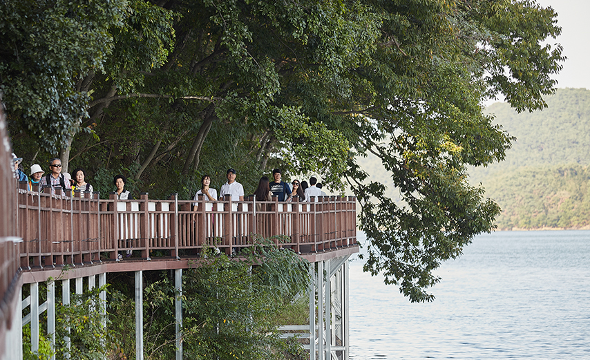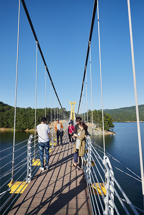 Walking up the stairs after parking at Jangseong Dam, we see Baegamsan Mountain far in the distance. This is where the Jangseongho Lakeside Trail begins. This is a 7.5 km long trekking course between Jangseongho Dock and Suseong-li in Bukyimyeon. It seems to be a popular choice among families with children, who enjoy the sights and sounds of both forest and lake at the same time. Every now and then, a tree branch stretches over the deck, providing shade from the autumn sun, and giving a glimpse of maple leaves turning red. At the end of the decked trail is a small pavilion, where visitors can rest. It’s a good idea to stop and sit for a while, as the uphill trail begins from here. Although the slope is not steep, it is a naked forest trail, where you have to step over tree roots and rocks. There’s no reason to hurry; you can go at your own pace. As the path is narrow, stop from time to time to let people pass in the opposite direction, sit on a rock every now and then, taking in the view of the lake. Walking along the forest trail, you will be greeted by a surprising sight. This is the Yellow Swinging Bridge, the highlight of the trail, located about 1.2 km from the starting point. The swinging bridge stretches across the lake, symbolizing the rise of Jangseong-gun, with 21-meter high columns designed like yellow dragons erected at its two ends. The entire bridge is yellow, true to Jangseong-gun’s nickname “Yellow City.”