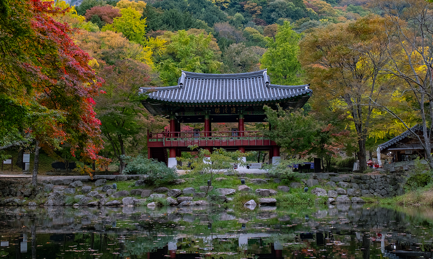 Pass the wood path of lined-up white oaks and maple trees, through the entrance of Baekyangsa Temple, and you will first spot Ssanggyeru. You will appreciate the breathtaking view of Ssangyeru shimmering in the pond.Baegyangsa is famous for the beautiful sight of Ssanggyeru Pavilion reflected in the pond. Colorful autumn leaves and the Ssanggyeru Pavillion are set against the majestic backdrop of Baegamsan Mountain and reflected in the pond, providing a glimpse of paradise in the water. A special feature of the maple trees here is their small leaves, earning the nickname ‘baby maple,’ as the leaves are as small as a baby’s hand. Although they are small, their color is a uniquely intense and beautiful crimson. Autumn reaches its peak when the baby maples display this enchanting color. That is when it will get crowded here, with visitors out to bask in the glory of late autumn. Autumn visitors can enjoy the harmony of colorful leaves embroidered overhead and beneath their feet, capturing the beauty of fall in their cameras and eyes.