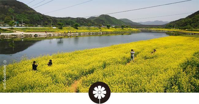 You are a step closer to the fields of Namdo. This is the way to Hwangnyonggang Ecopark, also known as Korea’s longest “Flower River.” This is because the Yellow Flower Festival has been ongoing since mid-October. The river of flowers unfolds before you as soon as you park. Over a billion autumn flowers such as orange cosmos, zinnia and sunflowers line the bank of the vast Hwangnyonggang River.