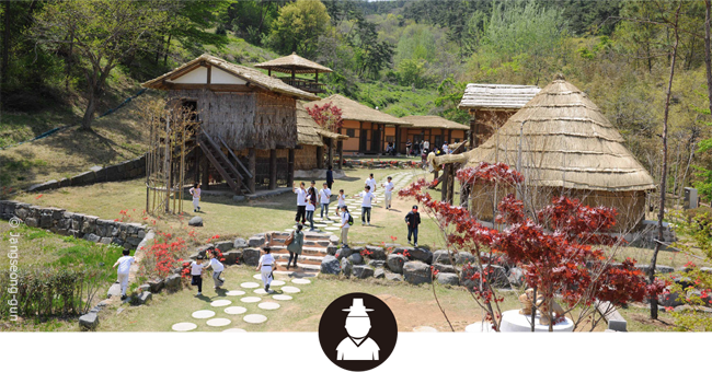 Walk up a little from there to reach the Hwalbindang Lodge, a reproduction of Hong Gil-dong’s fortress in Museongsan Mountain, Gongju, which was the final hiding place of Hong and his friends. Heading out from the lodge and crossing the bridge over a small valley, we reach a reproduction of Hong Gil-dong’s home. In another corner, there is a Korean traditional archery arena, where visitors can pick up the bow and arrow and try for a bullseye.