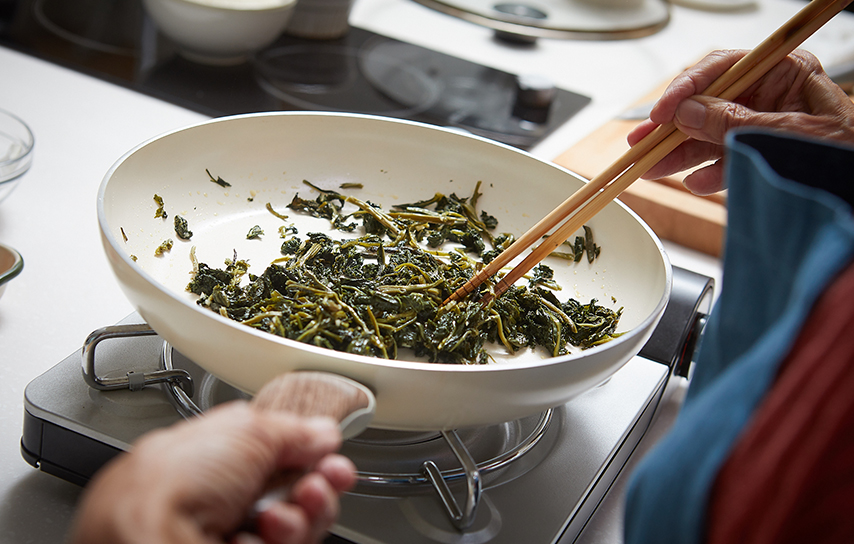 Nandi softened the tough vegetable and is finally ready to season it.Spread perilla oil or sesame oil on a pan, and pan fry the seasoned gondeure. You can make the thistle even softer by adding a splash of water and steaming it with the lid on the pan. Gondeure is pretty much done at this point and some people use this for a side dish. If you want to take it further and make gondeure-bap, spread this on the top of raw rice before you cook the rice. Other than putting the cooked thistle on top of the rice, it’s the same process as making steamed rice in a rice cooker or a pot.