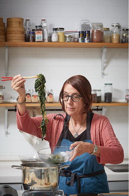 Nandi smells the sesame oil before seasoning the rice.Gondeure usually comes dried, and needs to be soaked in water overnight. Having a tough texture as a mountain vegetable, cooking involves a lot of softening. It should be boiled in water for about an hour to begin with. Leave it in the warm water until it cools down. Then gently squeeze out the liquid. Cut this vegetable horizontally into bite sizes, and lightly season it with sesame oil and soy sauce.