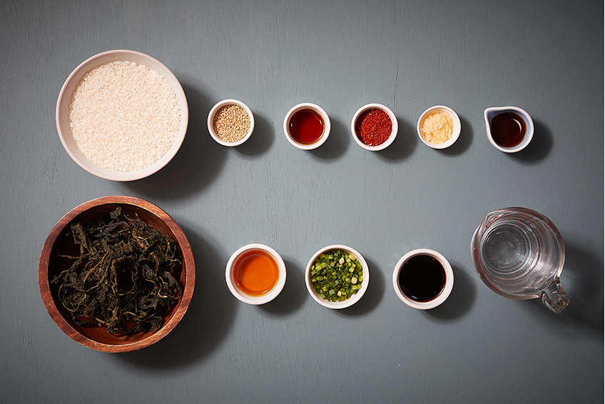 2 cups of white rice, 2 1/4 cups of water, dried gondeure thistle 20g, grated garlic 1 tsp, soy sauce 3 tsp, perilla oil (or sesame oil) 2 tsp, 1/4 cups of water (to add in a pan)