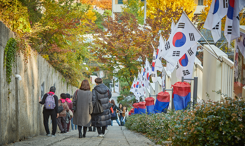 The national flag of Korea blows in the wind, and tourists look around the photos from old times along the 3.1 Independence Movement Road.“Apsan” literally means “a mountain in front.” True to its name, the Mt. Apsan Observatory is a place where you can enjoy a panoramic view of the city. For a more unforgettable experience, you can time your visit around sunrise or sunset. At night, when the city becomes adorned with lights, this spot is popular among photographers. To get to the observatory, you can take a 15-minute cable car ride, or hike up for an hour or so. The latter choice will allow you to immerse yourself in the beauty of autumn.