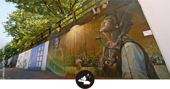 The late Kim Gwang-seok is still one of the most beloved singers in Korea. His hits are sung today by many people, both young and old. Next to Bangcheon Market, where he used to live, is a mural street themed on Kim Gwang-seok’s life and songs. The murals feature his lyrics, and his songs are being played over speakers. On Kim Gwangseok-gil street, you cannot help but sing along while paying tribute to the legendary singer.