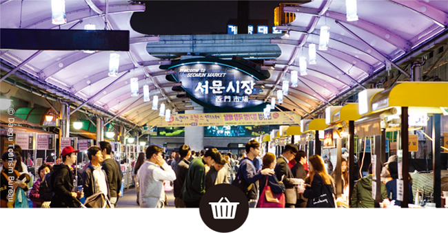 Seomun Market was one of the three major markets in the late Joseon era. Today, it maintains its reputation as a traditional market, specializing in textiles and food. Known as a food haven, the market’s signature dishes attract visitors from all over the country. One of the most popular is kaljebi, which is a combination of kalguksu noodle soup and sujebi hand-pulled dough soup. The tasty yet affordable dish has many standing in a long queue at lunch time. Another specialty is samgyeopsal jjajangmyeon, which is a dish of black bean noodles topped with grilled pork belly.