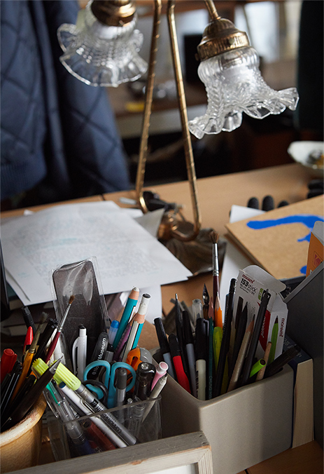All the pens and papers tell us how devoted he is to writing and reading.
