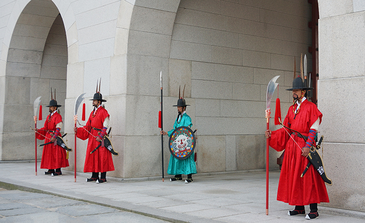 Palace guards are wearing hwando tied to their attire and a bow on the top. © shutterstockAlthough dramas often show swords worn with the hilt in the front, the sword was typically worn on the waist or side, with the hilt behind the body and the sheath hanging in front. This enabled soldiers for whom the bow and arrow was the main weapon in combat to shoot their arrows without being encumbered by the sheath. As the sword was hanging from a strap, its direction could be changed at will, and the sword drawn quickly from the sheath. It was the most practical weapon design. Forged from steel, the hwando is quite sturdy and does not break easily. The hilt and sheath were reinforced by wrapping them with shark skin or hemp cloth, or by lacquering the wood. Generals who were close aides to the king used orange swords, while ordinary generals and warriors had black swords. Swords were sometimes decorated with gold, silver or jade to emphasize their artistic value. A key example of such a work of art is daemobogeom, which is in the collection of the Suwon Hwaseong Museum. Its hilt and sheath are carved from the whole shell of a sea turtle, which allows the blade to show through the sheath, and are decorated with all kinds of precious materials, making it one of the most artistically valuable hwando swords.