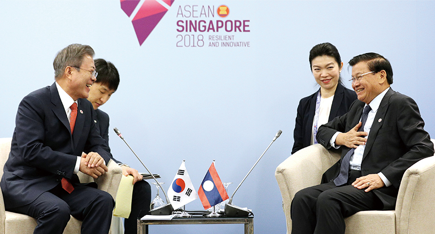 On the sidelines of the ASEAN Summit in Singapore, President Moon Jae-in holds a meeting with Prime Minister Thongloun Sisoulith of Laos, one of key partners for Korea’s New Southern Policy. © Yonhap NewsIn order to keep the momentum going, President Moon made the most of his latest Singapore visit, where he attended the ASEAN Summit and held a series of talks with ASEAN leaders.