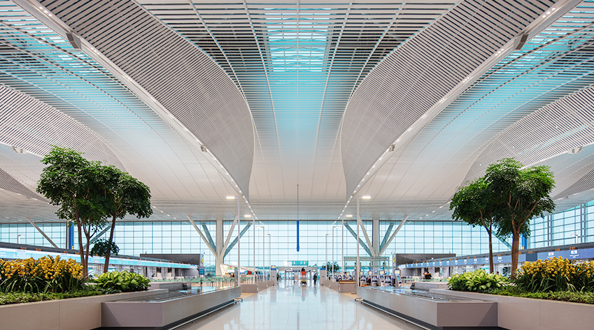 The high ceiling is finished with spatial design, and plants and flowers grow in every corner of the airport.A distinguishing feature of the new terminal is the unique approach toward airport construction, including its “smart, green and eco-port.” Eco-friendly elements have been adopted to keep pace with global standards for energy and the environment. Information and communications technology (ICT) aims to build a “smart airport” by enabling anyone to use the airport more easily and quickly.