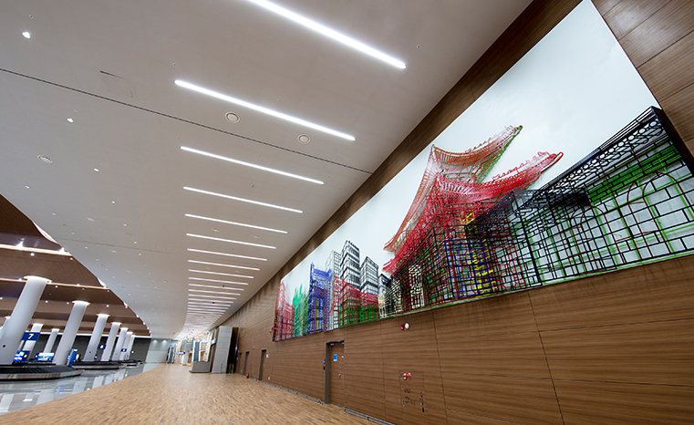 The first thing passengers encounter as soon as getting off the plane is the artwork “Bit. Fall,” in which water falls in the shape of letters and words. The roar of the “water word drops” freshens up the space. An algorithm program developed by German artist Julius Popp automatically chooses the words. This program is connected to the internet, gauges the number of the words posted on the newsfeed, prioritizes them, and selects the letters and words to be shown in the exhibit.