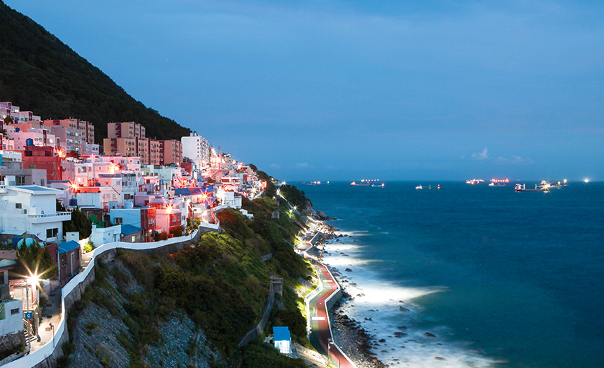 The night view of White Ford (Huinnyeoul) Cultural Village along the beach. © Busan Metropolitan City