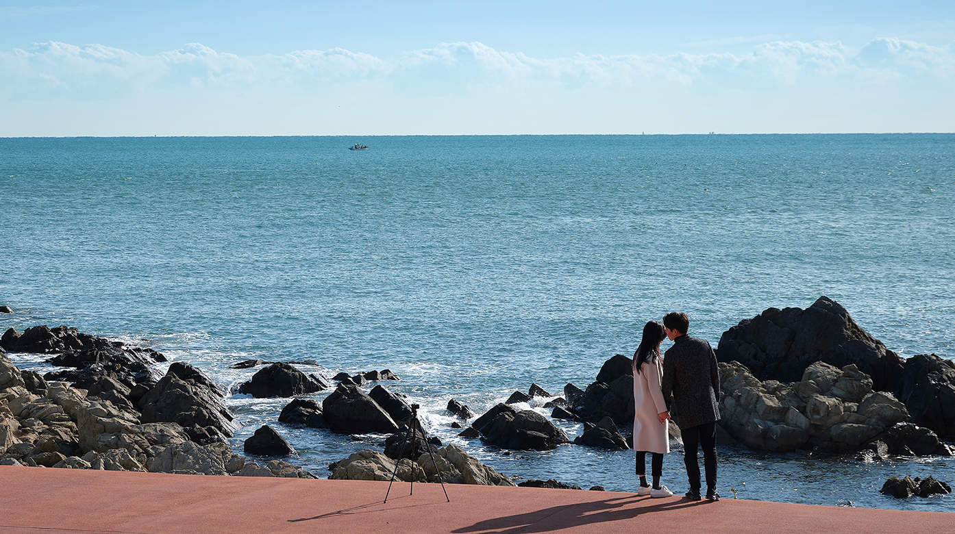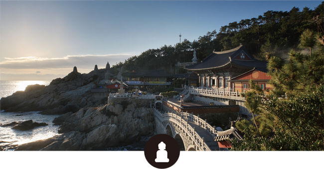A stone path leads to a Buddhist temple overlooking the vast ocean, with the air here thick with the scent of pine and burning incense. Among temples in Busan, Yonggungsa Temple is the place to watch the earliest sunrise. Wait about two hours after the sunrise, however, to see just how photogenic the temple gets.