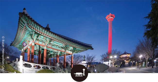 Busan Tower, built in Yongdusan Park in 1973, is a symbol of Busan. The observatory, at a height of 120 meters, offers a panoramic view of attractions such as the bridges Yeongdodaegyo, Busandaegyo and Namhangdaegyo, Busan Port, Jagalchi Market and Oryukdo Island. On a clear day, you can see as far out as Daemado Island. Busan Port and the surrounding areas are especially breathtaking at night. The twofloor observatory is said to have been modeled after the canopy of Dabotap Pagoda at Bulguksa Temple in Gyeongju, Gyeongsangbuk-do Province.