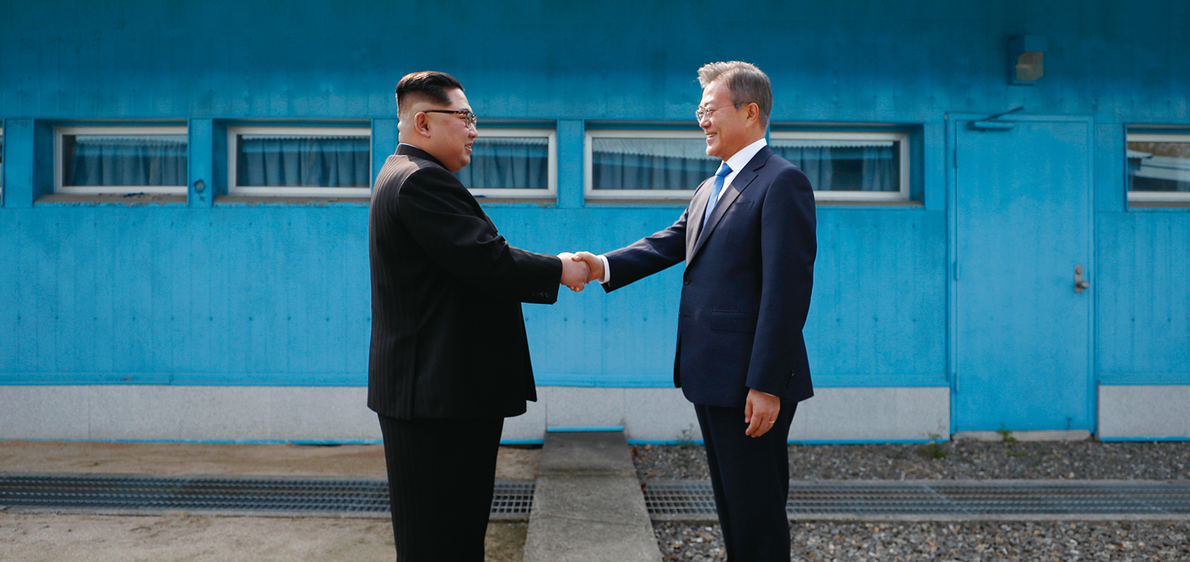 President Moon Jae-in (right) and North Korean Chairman Kim Jong Un shake hands in front of the Military Demarcation Line in Panmunjeom, prior to their first summit on April 27, 2018. © Yonhap NewsSoldiers from the two Koreas exchanged cigarettes and chatted at the Demilitarized Zone (DMZ) that divides the Korean Peninsula, the most heavily armed border in the world.