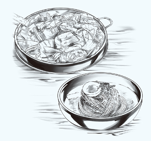 Makguksu (buckwheat noodles), which originated in North Korea, is one of the region's most ubiquitous foods. Many North Korean refugees came to the province during and after the Korean War (1950-53), finding themselves famished in a barren and mountainous land. The climate-resistant properties of buckwheat allow its seeds to grow well even in dry soil. People could produce a large harvest in the relative short period of 60-100 days. This is how these famed buckwheat noodles were born.