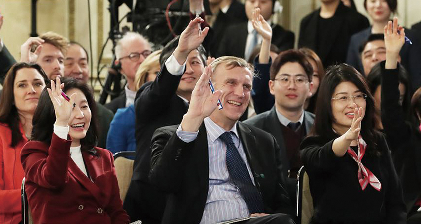 Foreign journalists on Jan. 10 raise their hands to ask questions during a Q&A session with President Moon Jae-in at his New Year’s news conference.