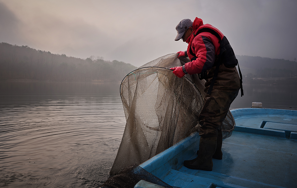 Smelts live only in clear and cold water, which is why they are not seen from spring to fall. Their habitat is deep water with low temperatures until fall; when winter comes, they swim up right under the ice looking for proper water temperatures and grow larger. The smelt’s nickname is “fairy in the lake” as its almost transparent body shines silver. Low in calories and rich in calcium, protein and vitamins, smelt tastes savory especially in wintertime. Eating the fish raw, fried or seasoned with vegetables is also appetizing, but Okcheon-gun is famous for doribaengbaengi, a crispy and salty dish of small fried fish arranged in a circle.