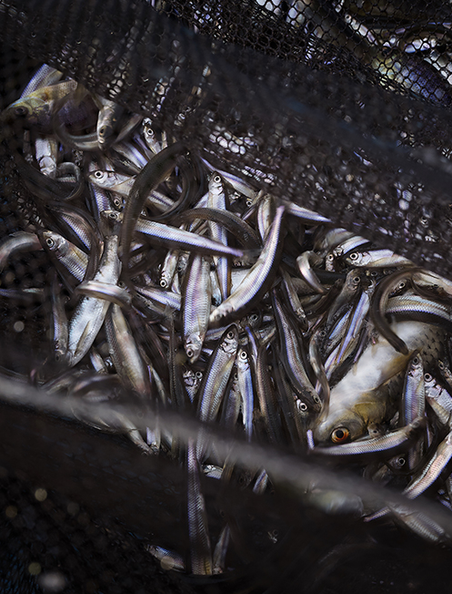 Big and small fish are kept in a net.Jjinhan Restaurant, located in the township of Cheongsan-myeon and at the same site over the last 30 years, has a name that sounds impressive. The names of freshwater fish dishes are displayed on local restaurants' glass wall, the most conspicuous among them being doribaengbaengi. The dish was named after its appearance: tiny freshwater fish such as smelts or minnows arranged in a circle. Of course, smelts are used in winter.